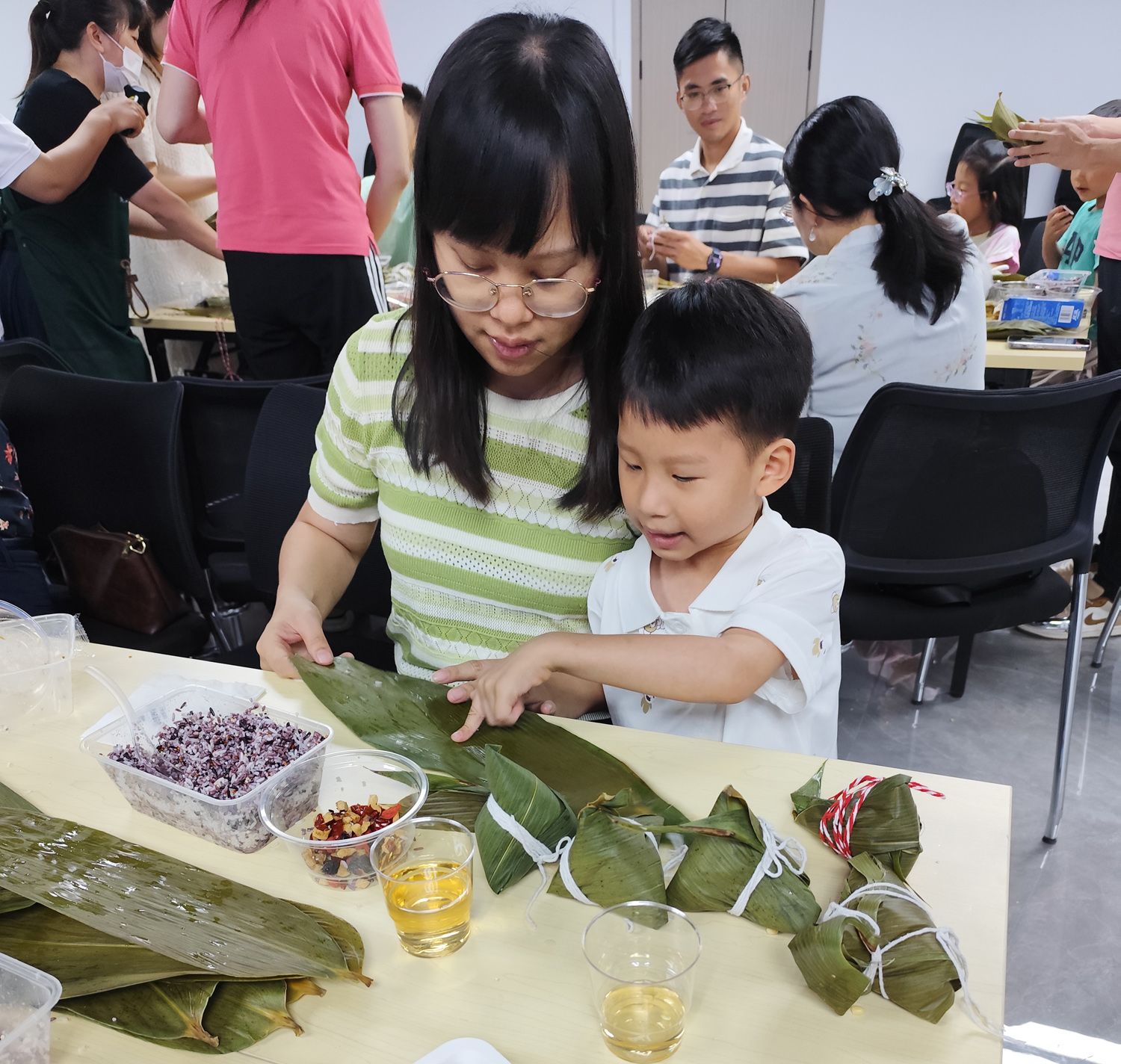 当天工作人员早早准备好糯米、红枣、红豆、粽叶、麻绳等包粽子的材料,整齐摆放的食材与翠绿的粽叶相互映衬,营造出浓厚的节日氛围。培训老师进行“包粽”示范,孩子们兴致勃勃地拿起粽叶,模仿着大人的样子尝试包粽子,虽然动作略显笨拙,包出的粽子也是形态各异,但热情丝毫不减,亲子间相互协作、互相鼓励,一片欢声笑语。